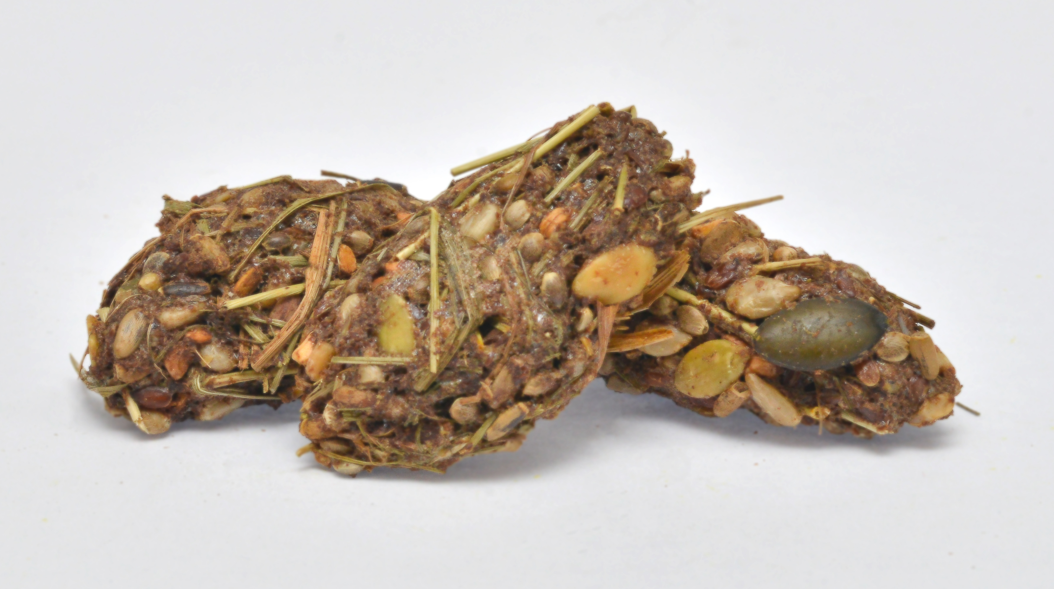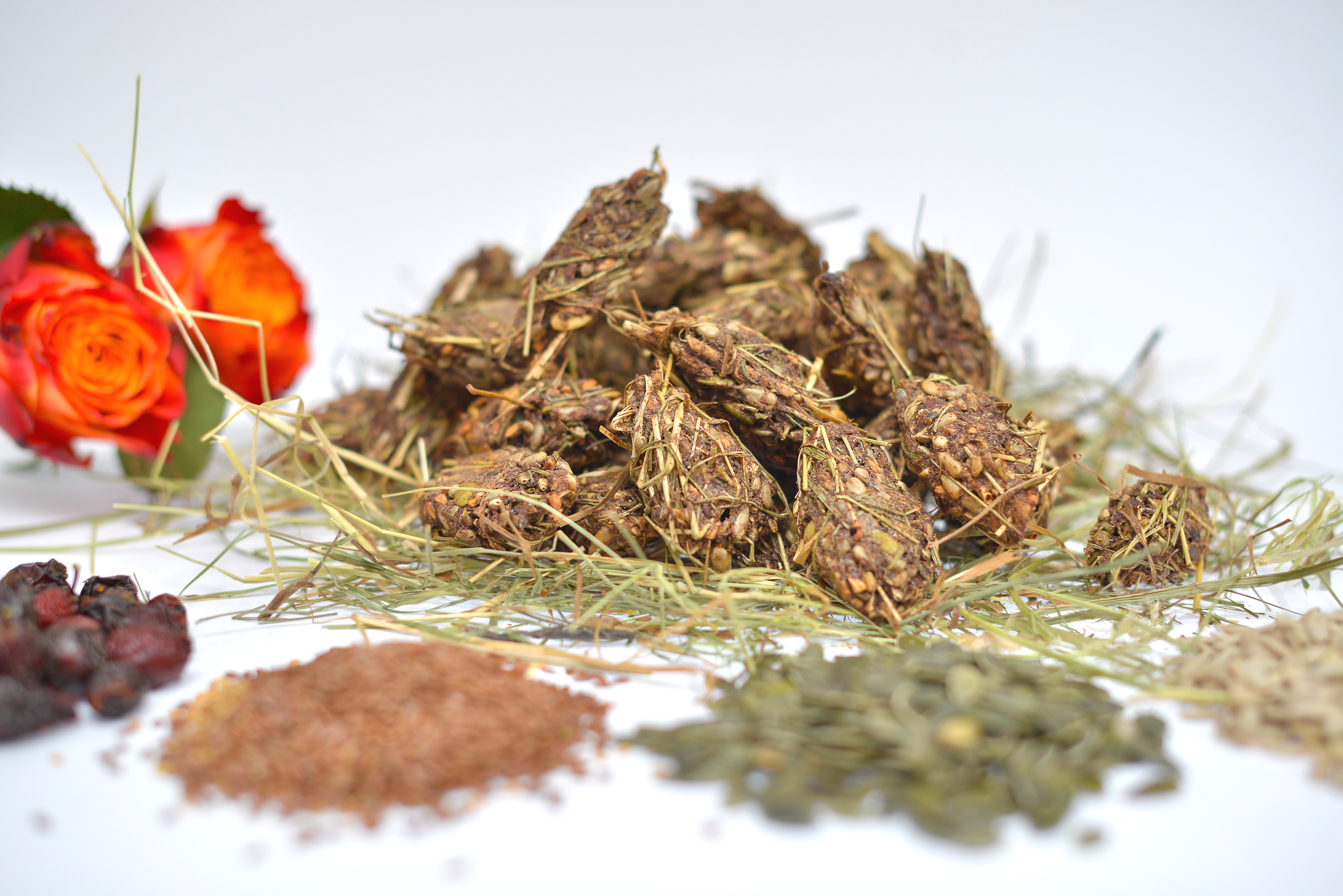 Zusammensetzung: Wiesenheu, Sonnenblumenkerne, Leinsaat (braun), Hanfsaat, Kürbiskerne, Hagebuttenkerne